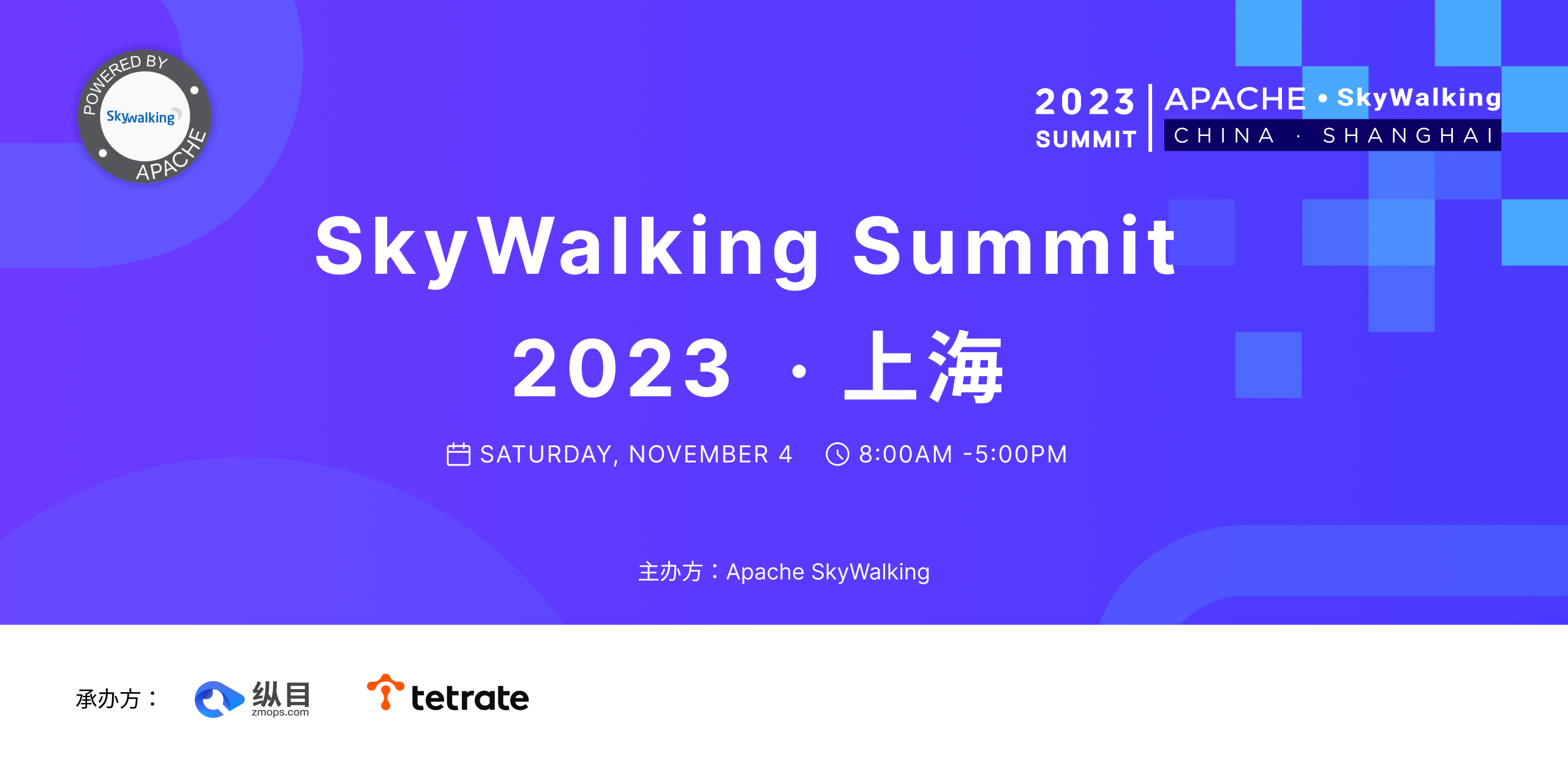 Apache SkyWalking hosts SkyWalking Summit 2023 on Nov. 4th, 2023, UTC+8, sponsored by ZMOps and Tetrate.